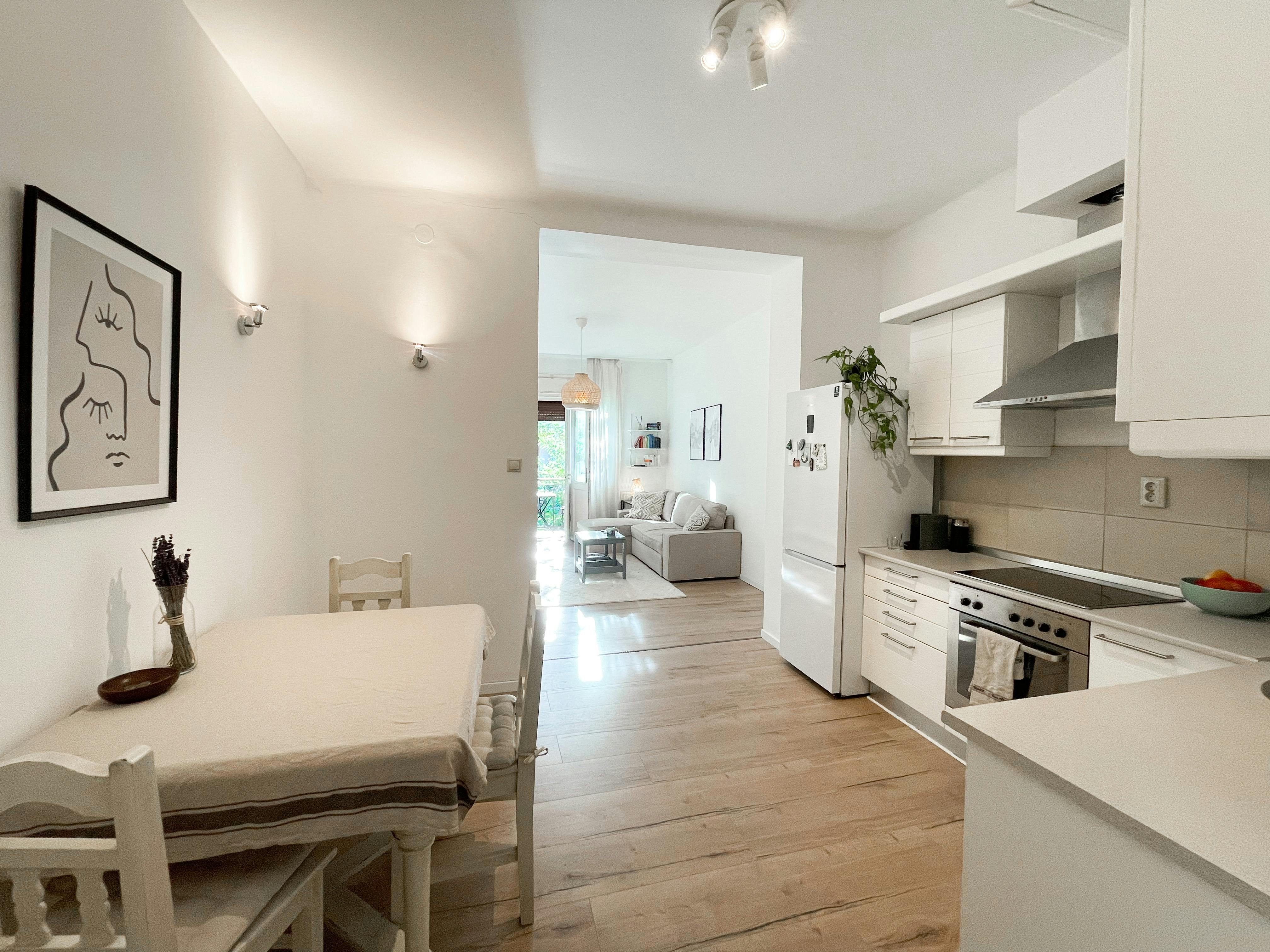 3 chambres 1 salle de bain pièce à vivre avec cuisine ouverte et une entréecouloir. Type de logement à louer à Budapest Hongrie. Apartment at the back of the building so no street noise.